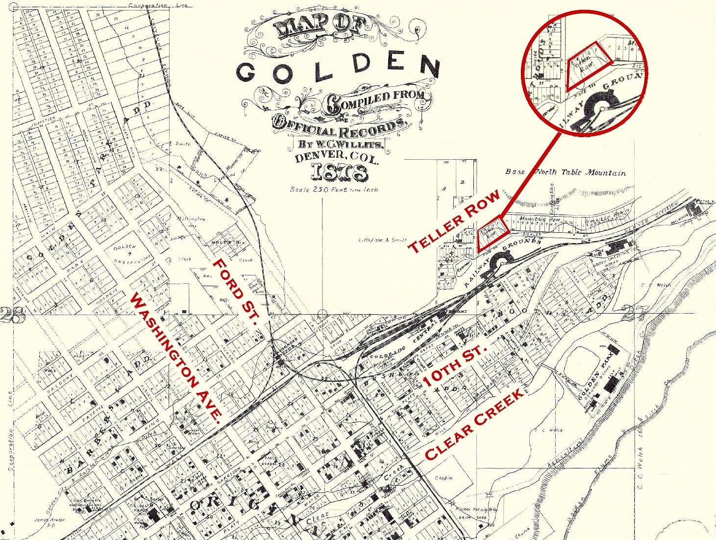 This story caught my attention because of the location. I have only seen Teller Row in one place–the 1878 Willits Map. Teller Row was one of several small streets north of the railroad yard, shops, freight depot, and roundhouse. That neighborhood would now be buried under Highway 58.