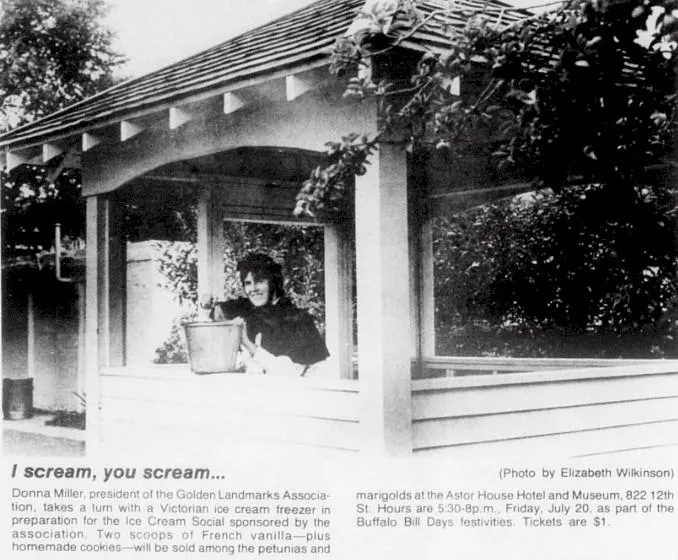 The July 18, 1979 Golden Transcript was promoting events planned for the upcoming Buffalo Bill Days weekend. One of the highlights would be Golden Landmarks Association’s ice cream social, in the back yard of the Astor House. The servers would be based in the gazebo, and chairs and tables were set out to allow people to relax in the garden