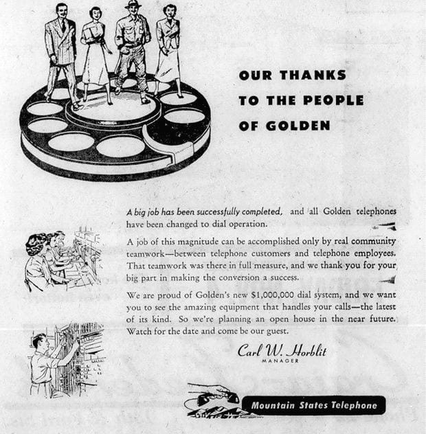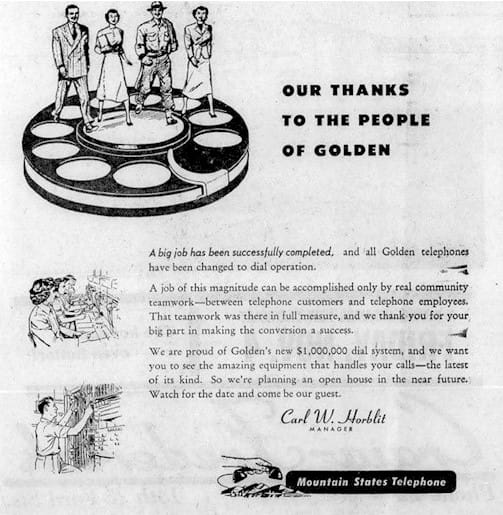 Golden joined the modern world in October of 1955–we got dials on our phones! Prior to that time, Golden callers placed all calls through a telephone operator. A $1,000,000 upgrade enabled the phone company to replace those operators with an electro-mechanical switching system. Every home and business in the service area got a new phone (with a dial!), and after the cutover, the company collected the “magneto” phones.