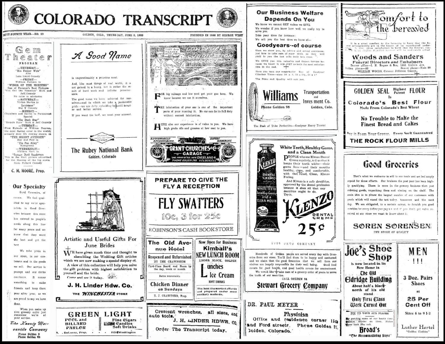 These are advertisements from the June 3, 1920 Colorado Transcript. The businesses were located as follows: