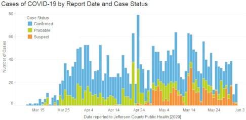 Jefferson County’s case count page says that as of 3PM yesterday, there have been 2,636 cases in Jefferson County (up from 2,610). There have been 172 deaths (up from 171) and 368 are hospitalized (unchanged). There are 216 known cases in Golden (up from 213).