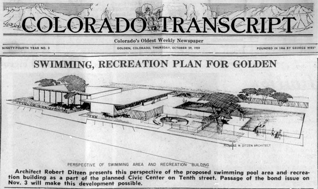 In 1958, Golden’s leaders–particularly the Chamber of Commerce–determined that we had outgrown our pioneer-era City offices. That spring, Heinie Foss, owner of the Foss Drugstore, led a committee to plan a new complex of buildings that would include the city offices, police and fire departments, a swimming pool, library, museum,and recreation center.