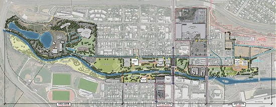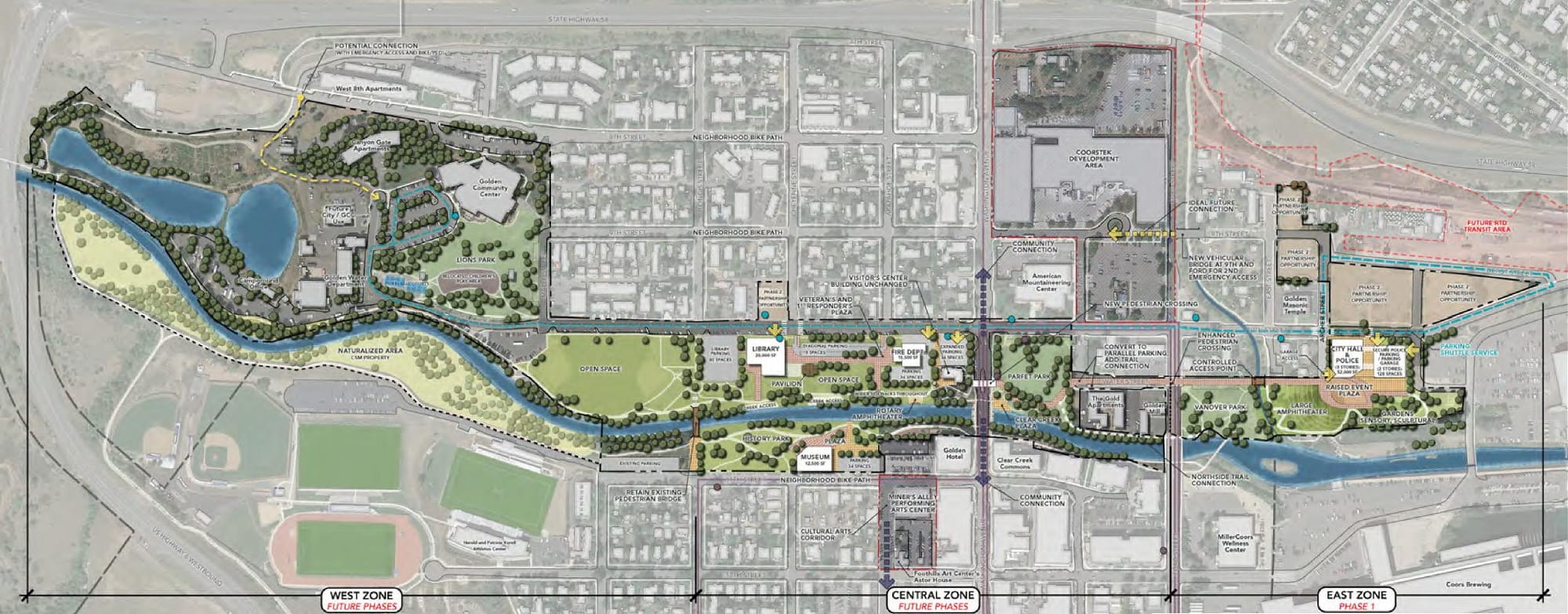 The big topic of the night is approval of the Heart of Golden plan. The meeting packet explains that phase 1 will focus on the eastern end of the creek front–a new city hall and police department. The park-like elements in the central and west areas will be planned several years in the future.