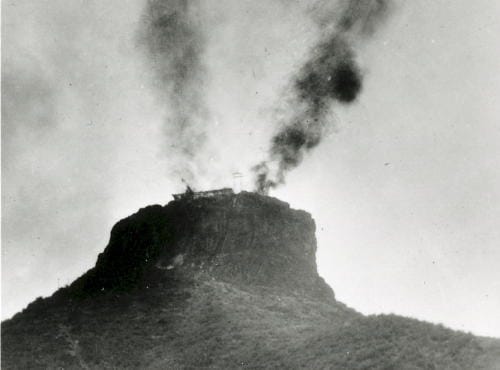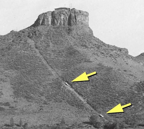 Yesterday’s post about the John J. Herold Pottery included this picture of Coors Porcelain, taken in the 1920s. One of the best things about that photo is something in the background: if you zoom in on Castle Rock, you can see the two cars of the funicular railway.