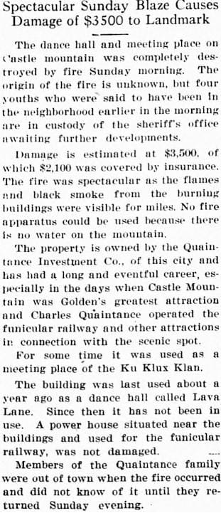 The same reader asked how it came to burn down–whether it was natural causes or arson. It was believed to be arson–whether the arson was started or funded by locals who didn’t like having the Klan and other undesirables up there we will never know. The official account that appeared in the Transcript said that they found four “youths” in the vicinity, and the sheriff had them in custody. You might expect that this would be a big event, and the local paper would follow the status of that case, but after the following article, which appeared in the Transcript on August 11, 1927, it was never mentioned again.
