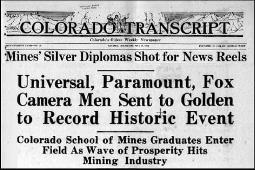 In 1934, the Mines community was excited about the novel new silver diplomas, and they spread the word to news outlets in advance of the graduation. The May 24, 1934 Colorado Transcript reported that the School of Mines might wind up in newsreels. The paper reported that camera men from Universal, Paramount, and Fox—attracted by news of the silver diplomas—took “several hundred feet of film which has been sent to New York City for editing.”
