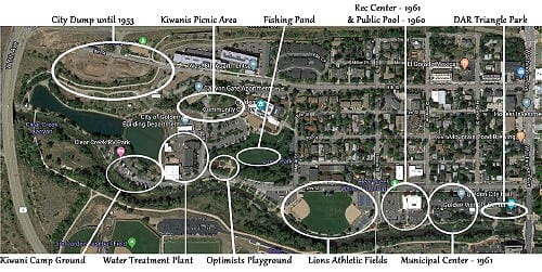 During the 1950s, several clubs in Golden were working to fix up the area on the north side of Clear Creek (now Lions Park). The Kiwanis Club built the camp ground. The Optimists built a playground. The Lions installed baseball diamonds, The DAR installed picnic tables. The City built a swimming pool.