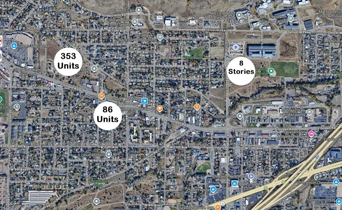 One of my readers suggested that I clarify the fact that all of those projects are in Pleasant View, outside of the City limits of Golden. The GW Apartments ("86 Units") and the one just breaking ground ("353 Units") are both under the control of Jefferson County, not the City of Golden. The newest potential project ("8 Stories") is on State land, and neither Golden nor Jefferson County has any control over what the State does with it.