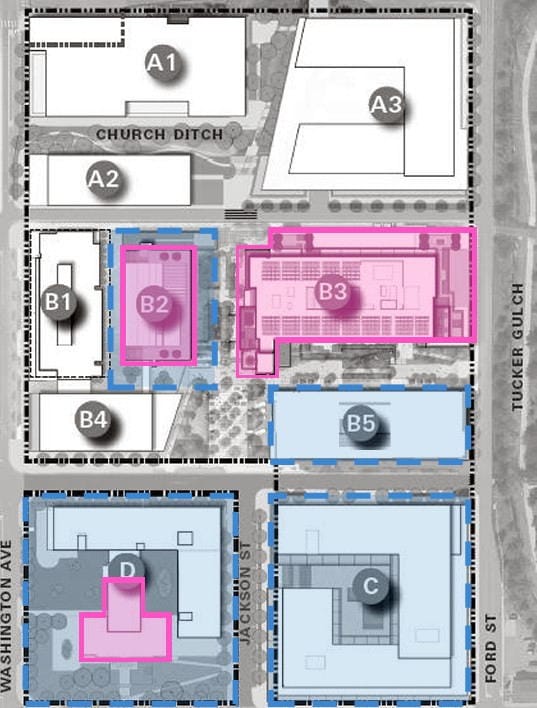The 5-story building remaining from the previous industrial site will become an office building.