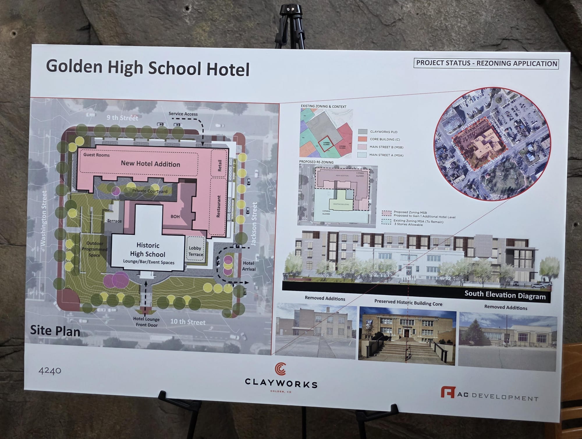 The former Mountaineering Center (former Golden Junior High, former Golden High School) will be remodeled to become a hotel. They will be building a taller addition on the back (north) side of the building. Guests will park in the new parking garage mentioned above.
