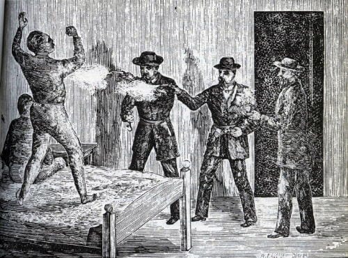 One might wonder why Ed Franklin would go upstairs to bed after his gang had shot a bartender. The testimony at the inquest explained that he was drunk. His guns weren’t “out of reach–” there were no guns in the room. The deputies were trying to put handcuffs on him and take him into custody, but there was much swearing and wrestling as he resisted arrest. The part where he instructed them to shoot him in the heart did appear in the testimony, and one of the deputies obliged.