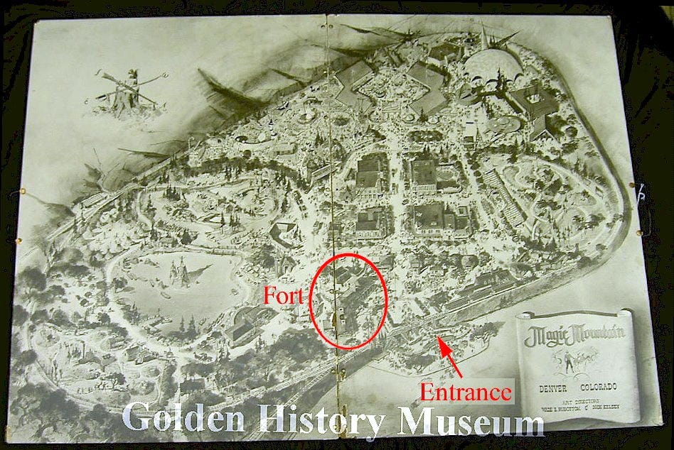 Magic Mountain was an ambitious plan to build a Disneyland-like amusement park here in Golden. The developers failed to find enough investors and the park quickly went bankrupt. The site reopened in the early 1970s under new ownership and operated for several decades under the name of Heritage Square.