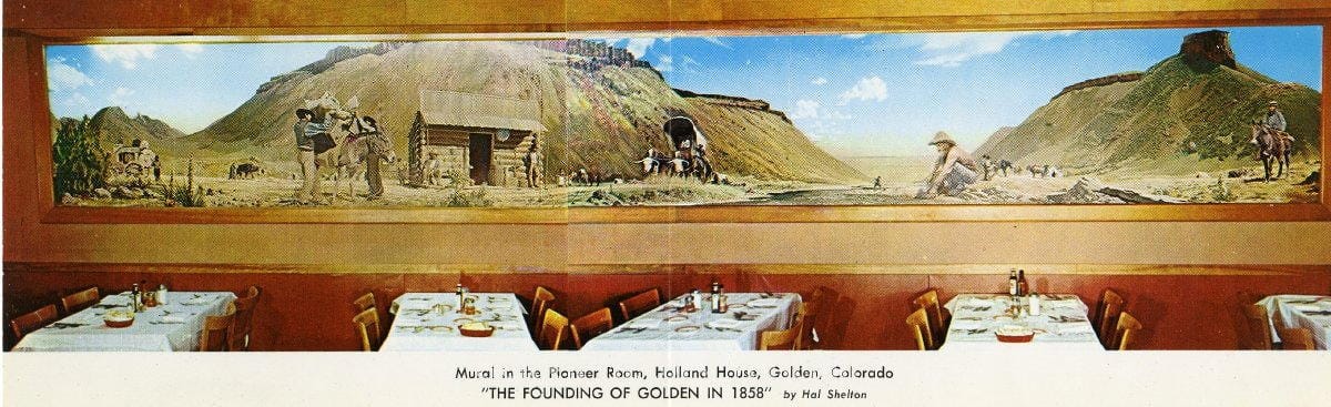 There was a “sister” mural hanging in the other dining room in the Holland House–the Pioneer Room. That mural was called “The Founding of Golden.”