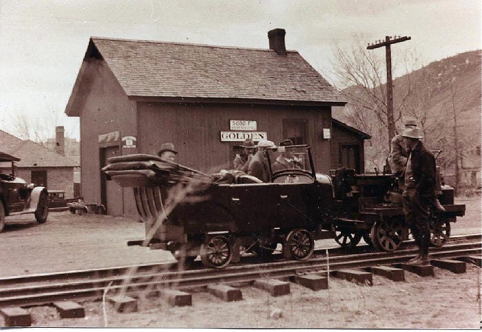 You may wonder: if there was no road, how did they drive from Golden to Idaho Springs? They rode in specially-adapted automobiles that had been equipped with small locomotive engines in front and wheels suitable for train tracks beneath.