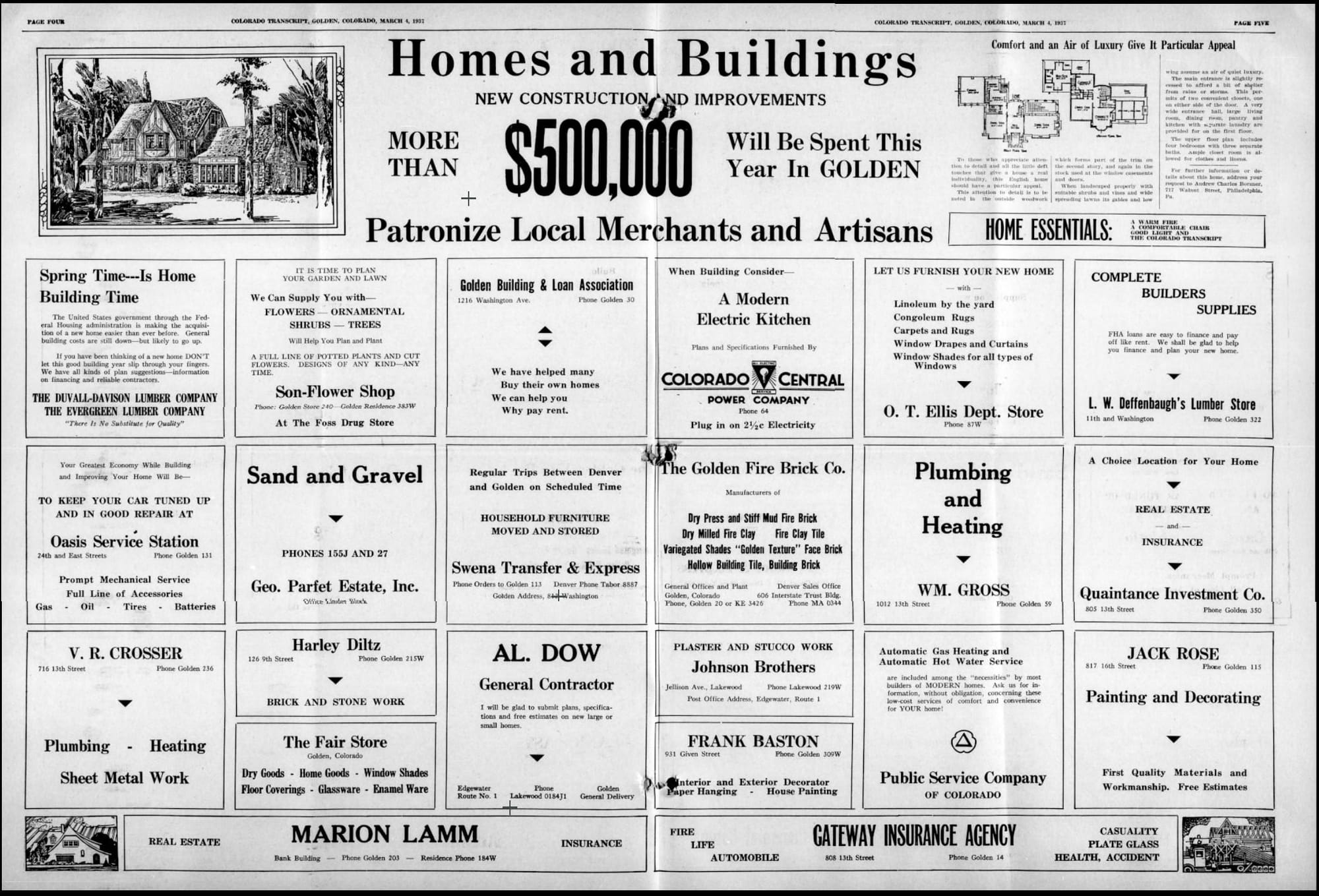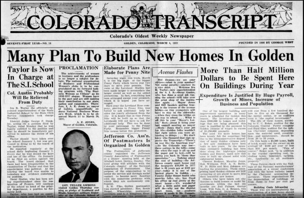 The March 4, 1937 Colorado Transcript was full of enthusiasm about the growth and development happening in Golden. The headline trumpeted,