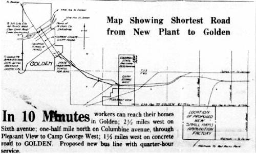 The plant was also bringing improvements to the infrastructure. Sixth Avenue was going to be significantly widened and improved to provide access to the plant, and it would be extended to Golden. The Denver and Intermountain Railway, which had carried people and freight between Denver and Golden since the 1890s, was being upgraded and a spur being built to service the new arms plant. There was talk of a new bus line to transport plant workers.