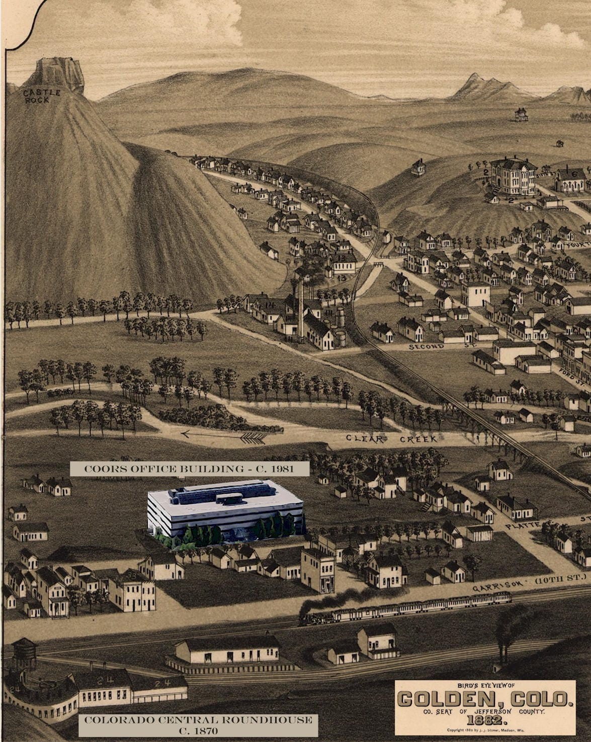 Failing to attract the Union Pacific, Loveland built his own railroad–the Colorado Central–and made Golden its headquarters. The Colorado Central came from Denver into the Goosetown neighborhood, then along 8th Street and thence through Clear Creek Canyon. It served Central City, Blackhawk, Idaho Springs, and Georgetown. The 1882 map above shows Goosetown, the railroad roundhouse, and a Colorado Central train. I’ve added the Coors office building that the City is buying to provide a sense of where the old railroad was.