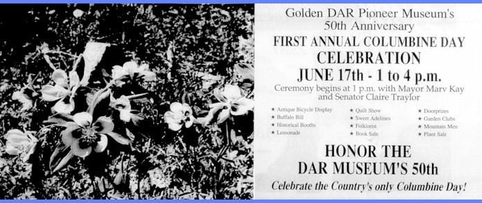 On June 17th, 1989, Golden celebrated the First Annual Columbine Day and the 50th Anniversary of the Golden DAR Pioneer Museum. The Golden History Museum was established by the Works Progress Administration in 1938 as one of the many Depression-relief projects in the Golden area. The museum closed when it lost federal funding and remained closed for the duration of World War II.