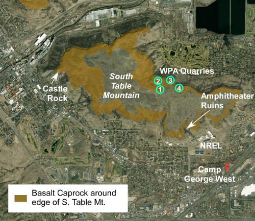 In 1935 the Works Progress Administration (WPA) replaced FERA. Some FERA projects were transferred, including the large basalt quarry operations on South Table Mountain. Basalt quarry-stone was used to construct new buildings at Camp George West, as well as for rip-rap to line the Cherry Creek and South Platte River channel-banks in Denver. By 1936, the City and County of Denver Improvements and Parks Department became a key customer of quarried basalt, because the crushed stone made excellent road mix (aka paving material). By 1937, 200 trucks a day hauled crushed basalt from South Table Mountain to various projects across the Denver area. One of the nearby WPA projects was construction of Alameda Parkway across Dinosaur Ridge to Red Rocks Park In 1937. Crushed basalt from South Table Mountain was used to pave the new road. Today, an historic marker and a basalt boulder stand as testimony to that effort at the southeast corner of County Road 93 (aka Hogback Road) and Alameda Parkway on the west side of Dinosaur Ridge.