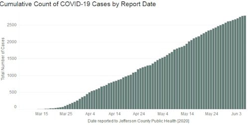 Jefferson County’s case count page says that as of 3PM yesterday, there have been 2,787 cases in Jefferson County (up from 2,775). There have been 180 deaths (up from 179) and 378 have been hospitalized (up from 376). There are 247 known cases in Golden (up from 240).