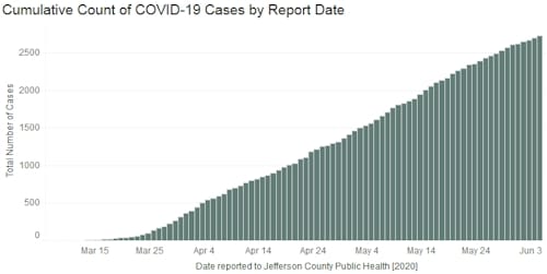 Jefferson County’s case count page says that as of 3PM yesterday, there have been 2,734 cases in Jefferson County (up from 2,694). There have been 178 deaths (up from 173) and 375 have been hospitalized (up from 373). There are 232 known cases in Golden (up from 222).