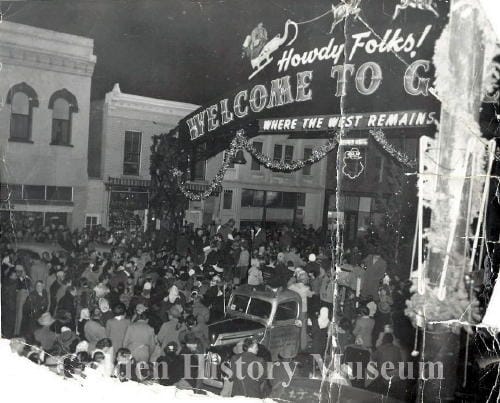 The jolly ol’ fella, Santa Claus, will arrive early in Golden this year–Saturday evening, December 3, at exactly 8 o’clock! Yes sir, he’s coming in from the north in a beautiful Buick convertible with a chauffeur. And Santa Claus Lane (Washington Avenue) will be all ready to receive him at the “Howdy Folks!” Welcome arch. The old boy’s sleigh will be mounted atop the arch with six beautiful reindeer all hitched and ready to go.