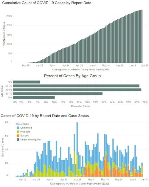 Jefferson County’s case count page says that as of 3PM yesterday, there have been 2,848 cases in Jefferson County (up from 2,811). There have been 186 deaths (up from 182) and 402 have been hospitalized (up from 390). There are 253 known cases in Golden (up from 252).