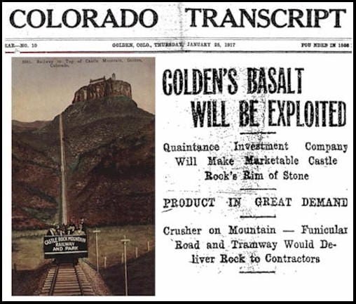 The Quaintances owned the Castle Rock funicular and a good part of South Table Mountain. They planned to install a “monster crusher” on South Table Mountain and use the funicular railway to bring down the crushed rock. The article explained that basalt was far superior to crushed granite for use in concrete or for gravel road beds.