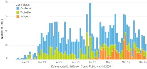 Jefferson County’s case count page says that as of 3PM yesterday, there have been 2,432 cases in Jefferson County (up from 2,316). There have been 152 deaths (up from 142) and 349 are hospitalized (up from 339). There are 201 known cases in Golden (up from 199).
