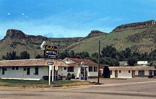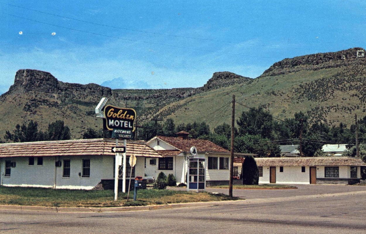 The July 20, 1976 Golden Transcript reported on the police log. They were investigating a robbery and burglary at the Golden Motel (map), where three men held up a desk clerk at knife point and got away with $10-15.