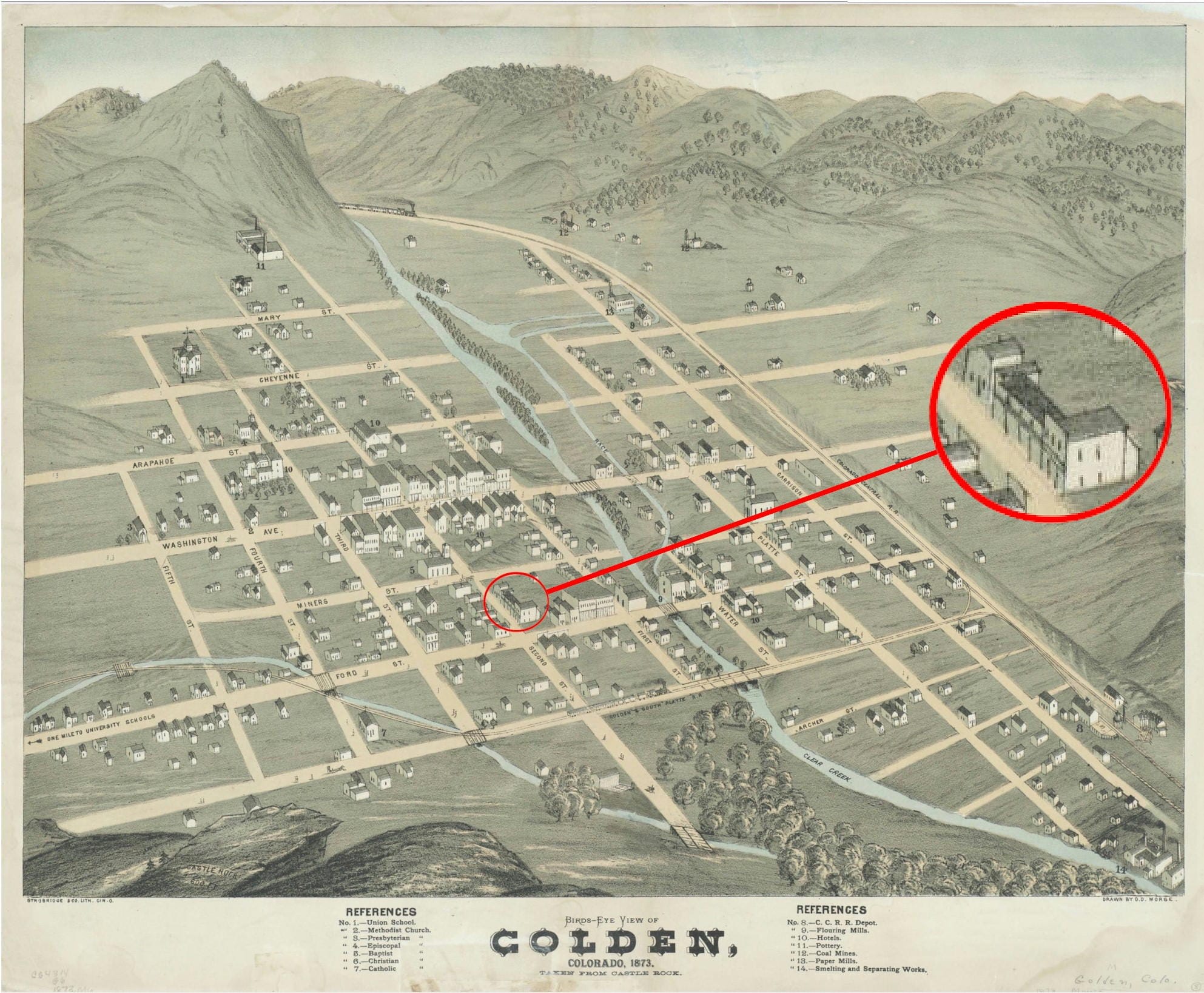 The town founders were determined to make Golden a real community—not just a rough mining camp—so they made it a practice to give a city lot to any woman who would settle here. Accordingly, they gave the land at 12th and Ford to Mrs. Johnson.