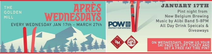 This year, Après Wednesdays will run from January 17 – March 27 and will be bigger and better than before. Sponsored by New Belgium Brewing, join us every Wednesday from 5:00 to 8:00 p.m. for live music, giveaways, ski and board tunes and happy hour all day. Show us your ski pass or lift ticket on Aprés Wednesday and get a free Fat Tire pint! Be sure to follow us on social media for more details.
