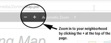 1) Find your home on the Zoning Map. Determine your zone by comparing the color of your home to the Legend in the lower right hand corner of the map.