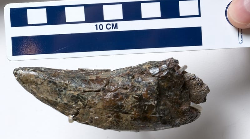 A T. rex tooth was discovered on the southwest flank of South Table Mountain, near the intersection of Rimrock Street and Golden Road, in 1874 by Peter Dotson, a student, and Arthur Lakes, part-time drawing and geology instructor at the newly-established Colorado School of Mines. The tooth was sent to O. C. Marsh at the Yale Peabody Museum where it lay forgotten until it was identified around 2000 by Kenneth Carpenter, a paleontologist at the Denver Museum of Nature and Science. Lesson: Be careful what you put in the basement and forget!