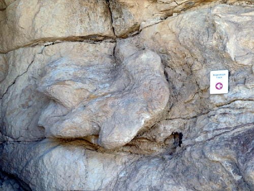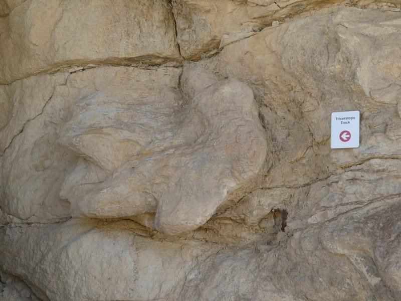 Triceratops Trail, west of Fossil Trace Gold Course, is home to a host of dinosaur tracks. A rare T. rex footprint is present next to tracks of a duck-bill dinosaur, Edmontosaurus. On the easternmost side of the trail are tracks of the three-horned dinosaur, Triceratops, hence the name of the Trail. From about 69 to 66 million years ago T. rex hunted Edmontosaurus and Triceratops, among other dinosaurs, in an ancient tropical rainforest and swamp in Golden.