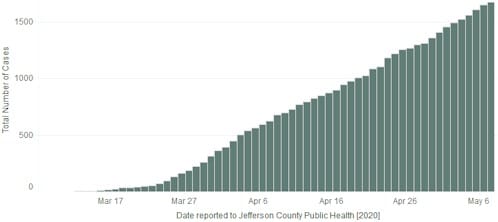Jefferson County’s case count page says that as of 3PM yesterday, there were 1,675 cases in Jefferson County (up from 1,633). There have been 91 deaths (up from 87) and 303 are hospitalized (up from 299). There are 129 known cases in Golden (up from 127).