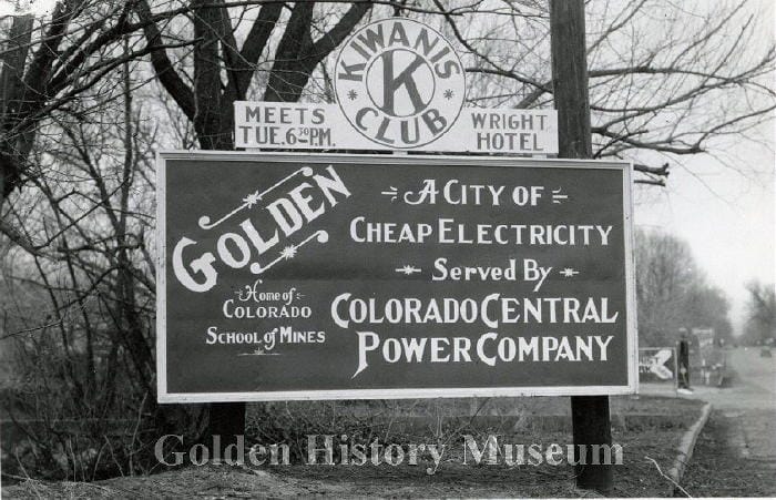 This is a black and white photograph of a large sign reading “Golden / Home of Colorado School of Mines / A City of Cheap Electricity / Served by / Colorado Central Power Company.” Above the main text of the sign is a circular Kiwanis Club logo flanked by “Meets Tue. 6:30 P.M. / Wright Hotel.” Behind this sign in the background a sign in the shape of an arrow pointing left is visible, which reads “Golden Tourist Park,” a business that was located near Jackson Street and 23rd. This photo is one of four similar photos of the same sign taken from slightly different angles.