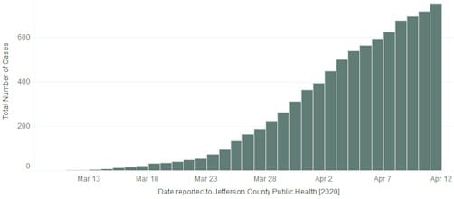 Jefferson County’s case count page says that as of 4PM yesterday, there were 753 (up from 704) “confirmed, probable, suspected, or under investigation” cases in Jefferson County. There have been 27 deaths (up from 25) and 185 are hospitalized (up from 175). There are 67 known cases in Golden (up from 64). If you want to see the growth in graphic format, here you go: