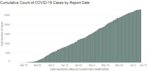 Jefferson County’s case count page says that as of 3PM yesterday, there have been 2,811 cases in Jefferson County (up from 2,787). There have been 182 deaths (up from 180) and 390 have been hospitalized (up from 378). There are 252 known cases in Golden (up from 247).