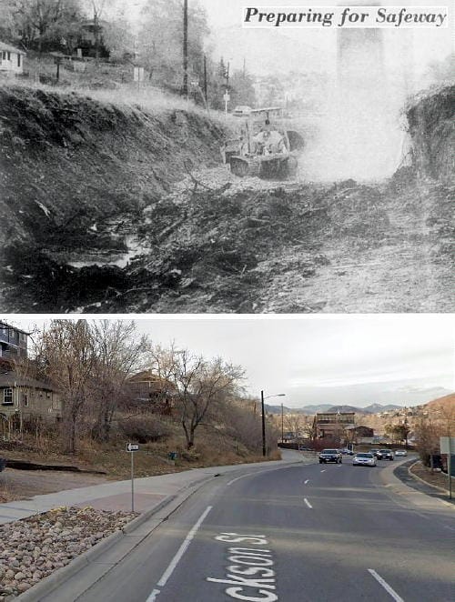 The October 18, 1978 Golden Transcript included the top photo, showing a sizeable excavation on Jackson Street. Safeway was getting ready to build their current store at that time, and the City was installing an 8 foot storm drainage culvert in preparation.