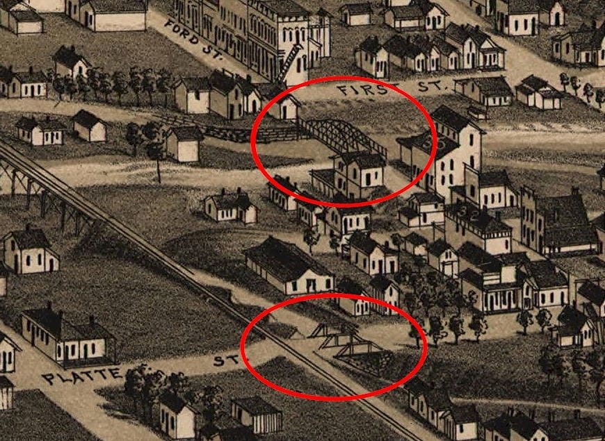 They reviewed bids for constructing a bridge on Platte Street (now 10th) over Tucker Gulch. They accepted the low bid, submitted by Gustave Haas, for $450. “It is to have stone abutments and wing walls, the superstructure to be of wood with hand rails at each end.”