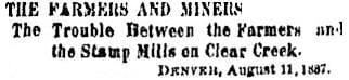In 1882, the farmers began trying to put legal pressure on the mines and mills to stop polluting Clear Creek. They had no luck. They tried again, with more emphasis and organization, in 1887. By this time, agriculture had become a more important component of our economy, but they still made no headway.