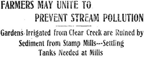 The matter rose to the surface again in 1915. By this time the farmers were beginning to organize into Granges, which allowed them to combine their voices to lobby the legislature. In 1917, the Granges initiated a “Pure Clear Creek” campaign. In 1919, they were still lobbying and proposed a bill which would require the mines and mills to stop polluting the Creek. They agitated for several years, with no notable success.