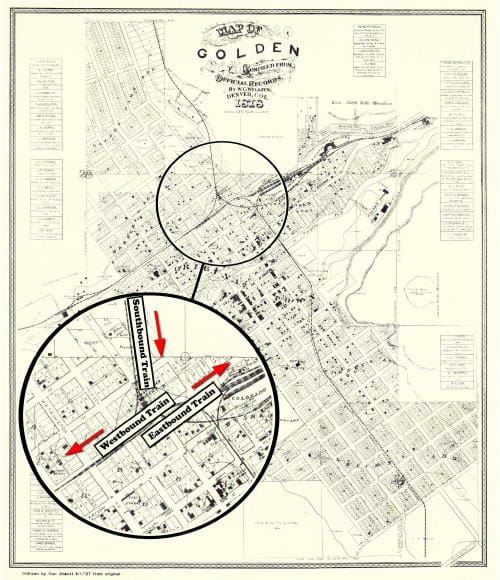 The November 2, 1905 Colorado Transcript reported a terrible train accident. A southbound train was coming downhill, on tracks that paralleled Tucker Gulch. Two trains–one eastbound, for Denver, and one westbound, for the mountains–waited on tracks at the bottom of the hill. The rails were wet and the hill was steep. The engineer of the southbound train lost control and rammed the westbound train.