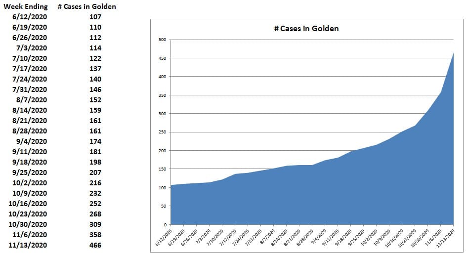 JCPHD updates these numbers Monday through Friday at about 3 PM. Here’s a summary of growth over the past week, based on Jeffco Public Health’s Case Summary Page: