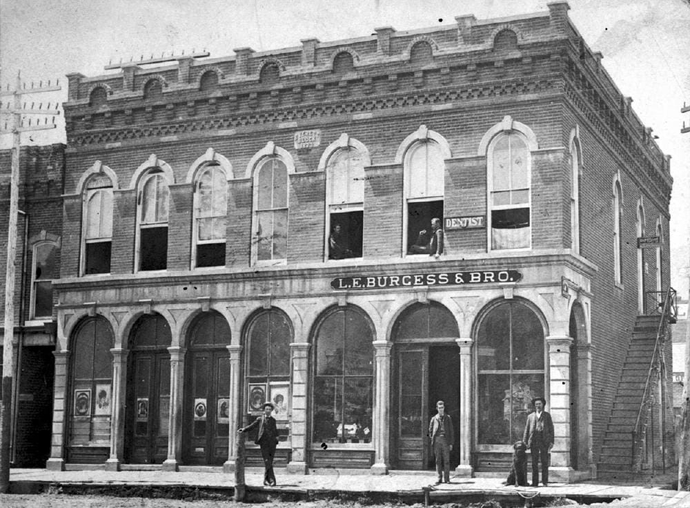 From the Denver Public Library Western History Collection’s notes about this image: Call Number: X-9847 Three men and a dog pose on boardwalk in front the 1873 Everett Block, 1200 Washington Avenue, Golden, Jefferson County, Colorado. The two- story brick commercial building features seven second-story arched windows, doorways with keystones and an elaborate cornice. Francis E. Everett, mayor and Golden businessman, contracted John H. Parsons to build this building designed by the Baker Brothers, architects. Signs read: “L.E. Burgess & Bro.,” “Dentist,” above side stairway: “Colorado Telephone Co. City And Outside Communications, Messenger Furnished.” Several posters of women hang in some of the first floor windows. between 1873 and 1900