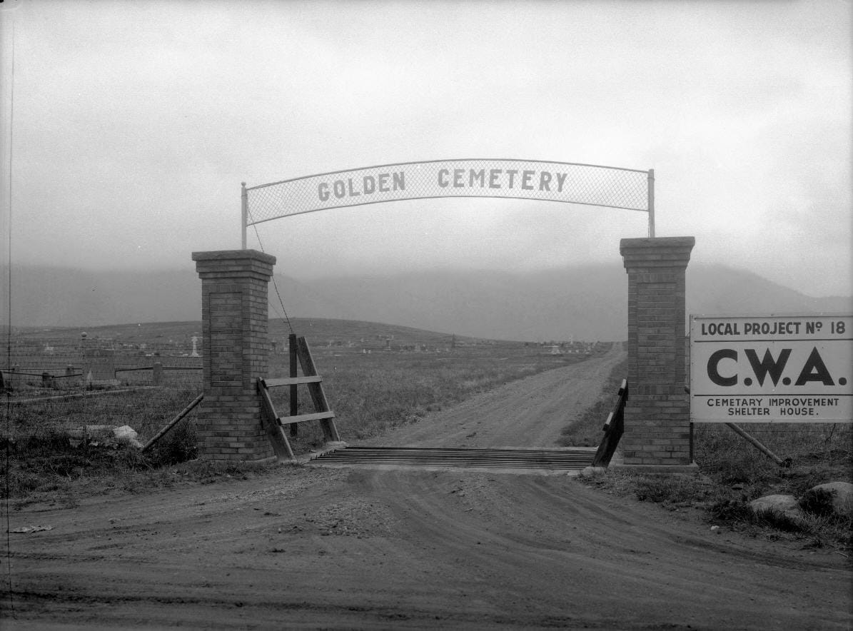 Finally, I checked the Denver Public Library’s Western History collection, and eureka! I found a photo of the Golden Cemetery sign taken in 1935, when the W.P.A. was cleaning up the cemetery and building a new office.