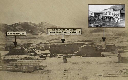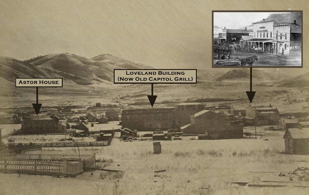 The Denver Public Library estimates the date of this photo as 1868. In it, you can see the Astor House (1867) and the Loveland Building (1866). In the distance–on the right side–are large store buildings, recognizable from other early photos of downtown.