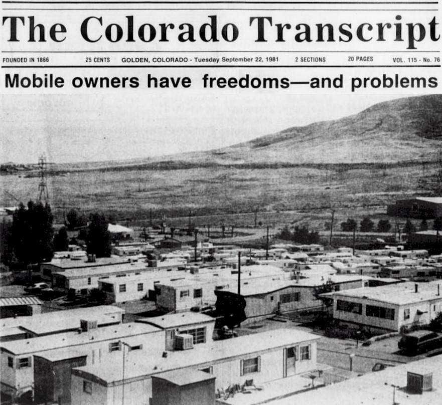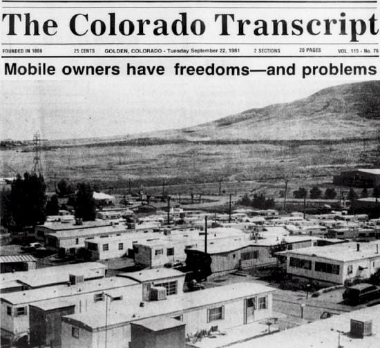 The September 22, 1981 Golden Transcript reported that “Mobile owners have freedoms—and problems.” The article said there were 1,700 mobile homes in Jefferson County–1,300 of them in Golden and Pleasant View. The newspaper interviewed several residents. They said they liked the location and their neighbors, but were concerned about the rising costs.