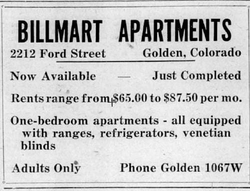The January 29, 1953 Colorado Transcript announced that work was starting on a new 21-unit apartment house in the 2200 block for Ford Street. It was to be constructed of fireproof brick and would cost $100,000 to build. The owner was William H. Scofield, a Denver attorney.